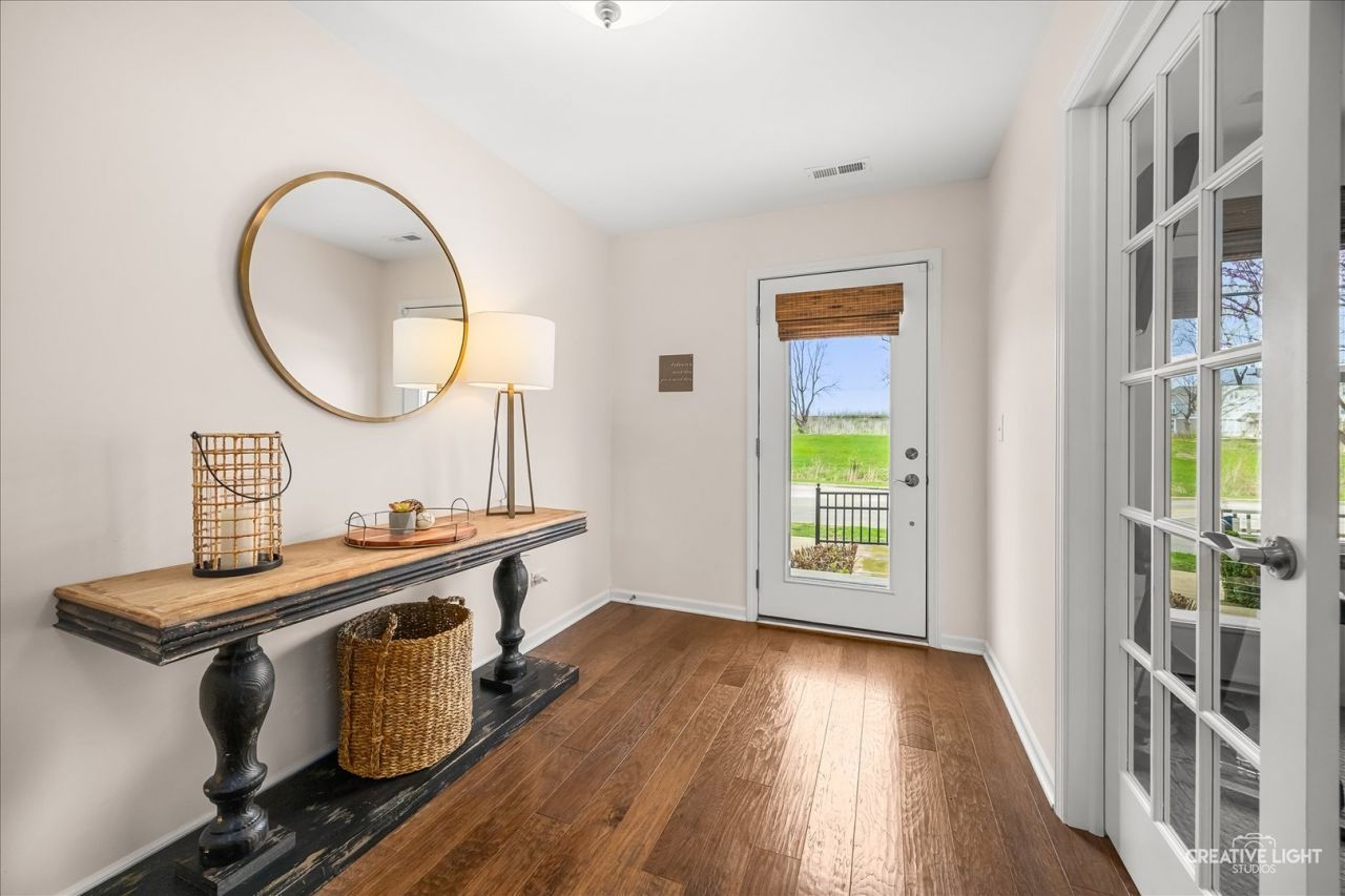 Welcome to the Uptown at Seven Bridges! This community is known for its vibrant lifestyle, where you can walk right out the front door and enjoy all the amenities and activities Seven Bridges has to offer. Stunning expanded model with a rare 4th-floor bonus room, fireplace, and private terrace! The welcoming front patio leads into the foyer featuring upgraded 5 hardwood flooring and French door entry to a bright, private first-floor office with abundant windows and blinds. The second level showcases an open-concept layout with hardwood flooring, extensive crown moulding and recessed lighting throughout. The sun-filled family room offers access to a private balcony, while the chef's kitchen impresses with abundant white cabinetry, stainless steel appliances, upgraded sink, gleaming quartz countertops, subway tile backsplash, a massive island with breakfast bar and custom pendant lighting, plus a spacious dining area. Upstairs on the third level, you'll find convenient laundry and three generously sized bedrooms, including a luxurious primary suite with a custom closet and private bath featuring a dual-sink vanity and oversized glass shower. The fourth-floor retreat is a true showstopper-your own private sanctuary with vaulted ceilings, hardwood flooring, and a cozy fireplace, plus access to the terrace. Attached garage with workbench. Ideally located near dining, shopping, entertainment, golf, commuter train, and expressways- this is one you don't want to miss!